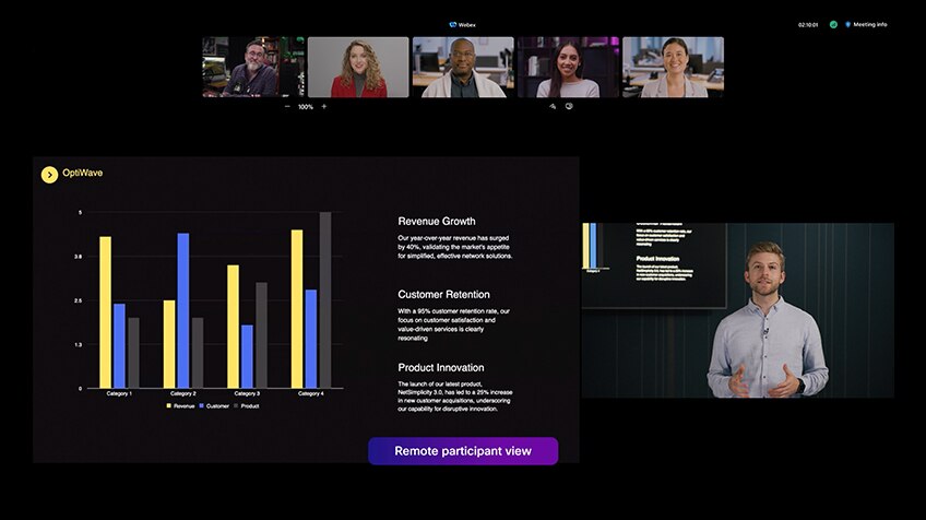 The multi-lens Quad Camera uses powerful AI processing to provide a best overview of audience members during the presentation, ensuring equal visibility. To further enhance the experience, deploy an intelligent, IP-based Cisco tracking camera for a wide field of view, powerful optical zoom, and dynamic views of one or multiple presenters as they move around the stage. By enabling Presenter and Audience view on the room device, you can select between local presenter, remote presenter, hybrid presenter, and auto modes to select the camera switching that best suits the session.