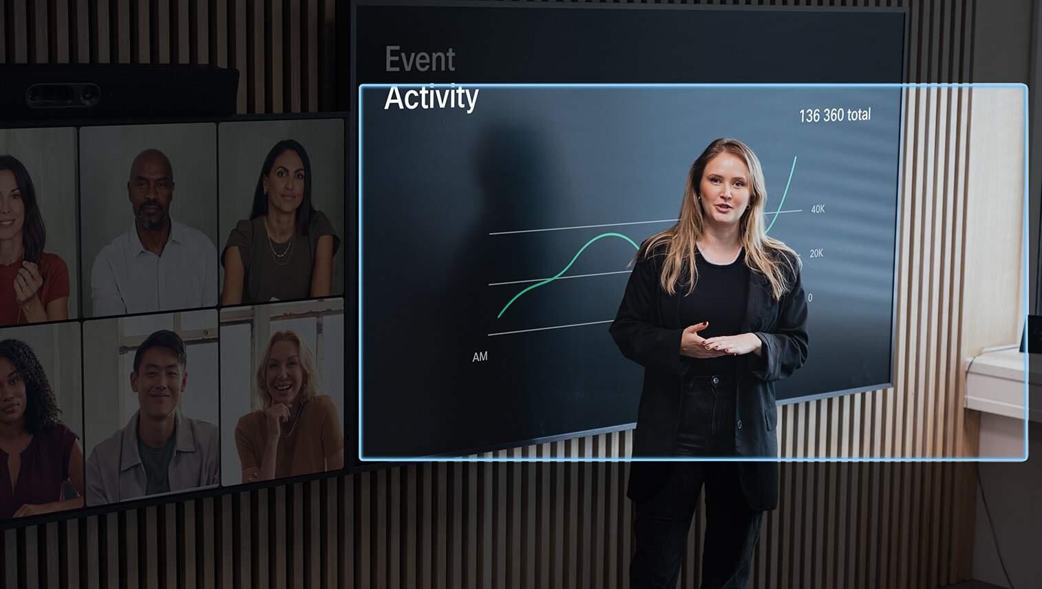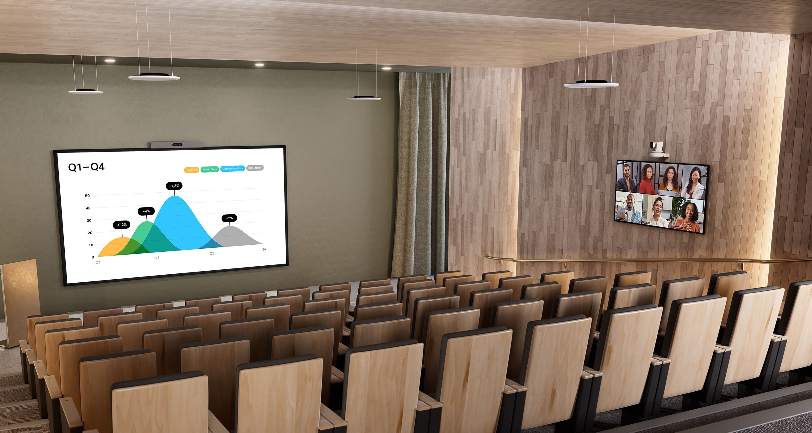 Offer the ultimate auditorium and seminar experience—even as presenters move around the stage—with AI-powered speaker tracking and silent pan-tilt-zoom. With a prominent view of in-room and remote facilitators and speakers, you can provide a front-row seat to the audience no matter where they are while delivering immersive, crisp sound for everyone.