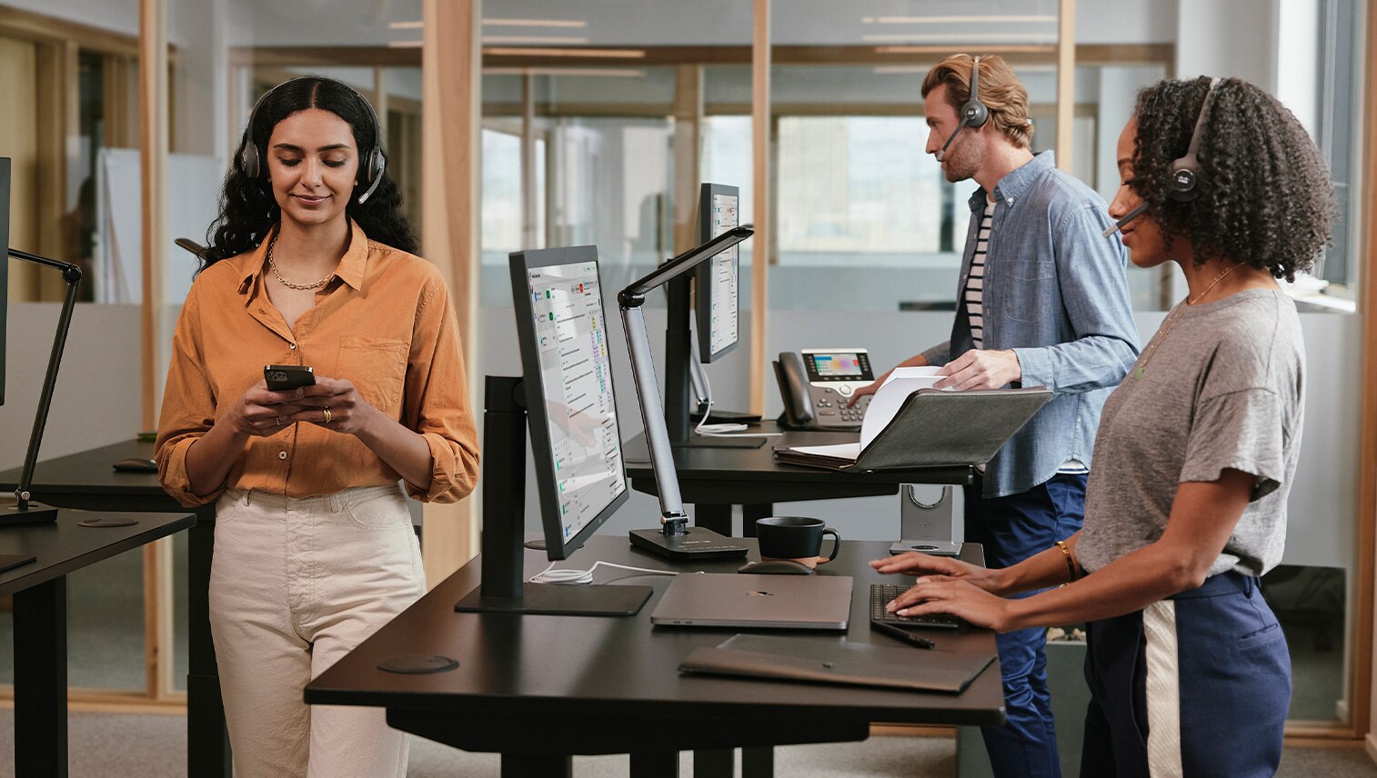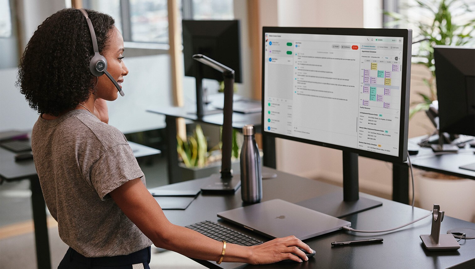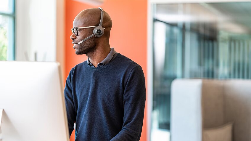 The Desk Phone 9800 Series comes with an enhanced speaker, a new bass-enhancing acoustic enclosure, and AI for noise removal. Adding the Headset 560 helps to further reduce background noise with unidirectional microphones and a boom arm that isolates sound so even in a room filled with commotion, your agents stay focused, and your customers will always get a great experience.