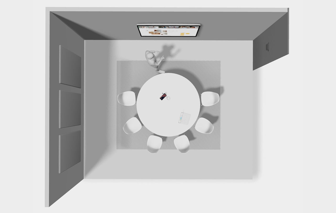 The horizontal table shape helps everyone be seen and heard while the dimensions of the space allows people to move around and interact with the 75” video device.